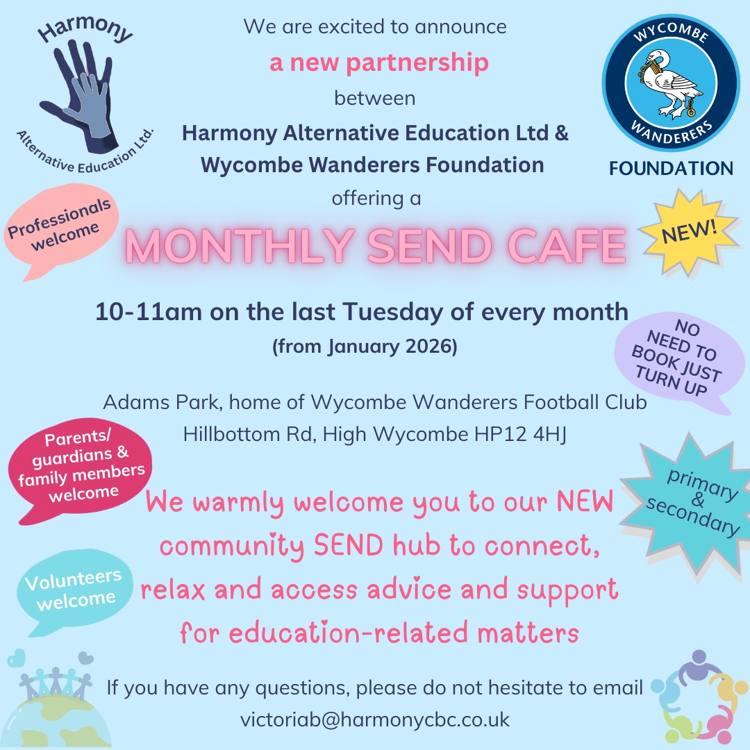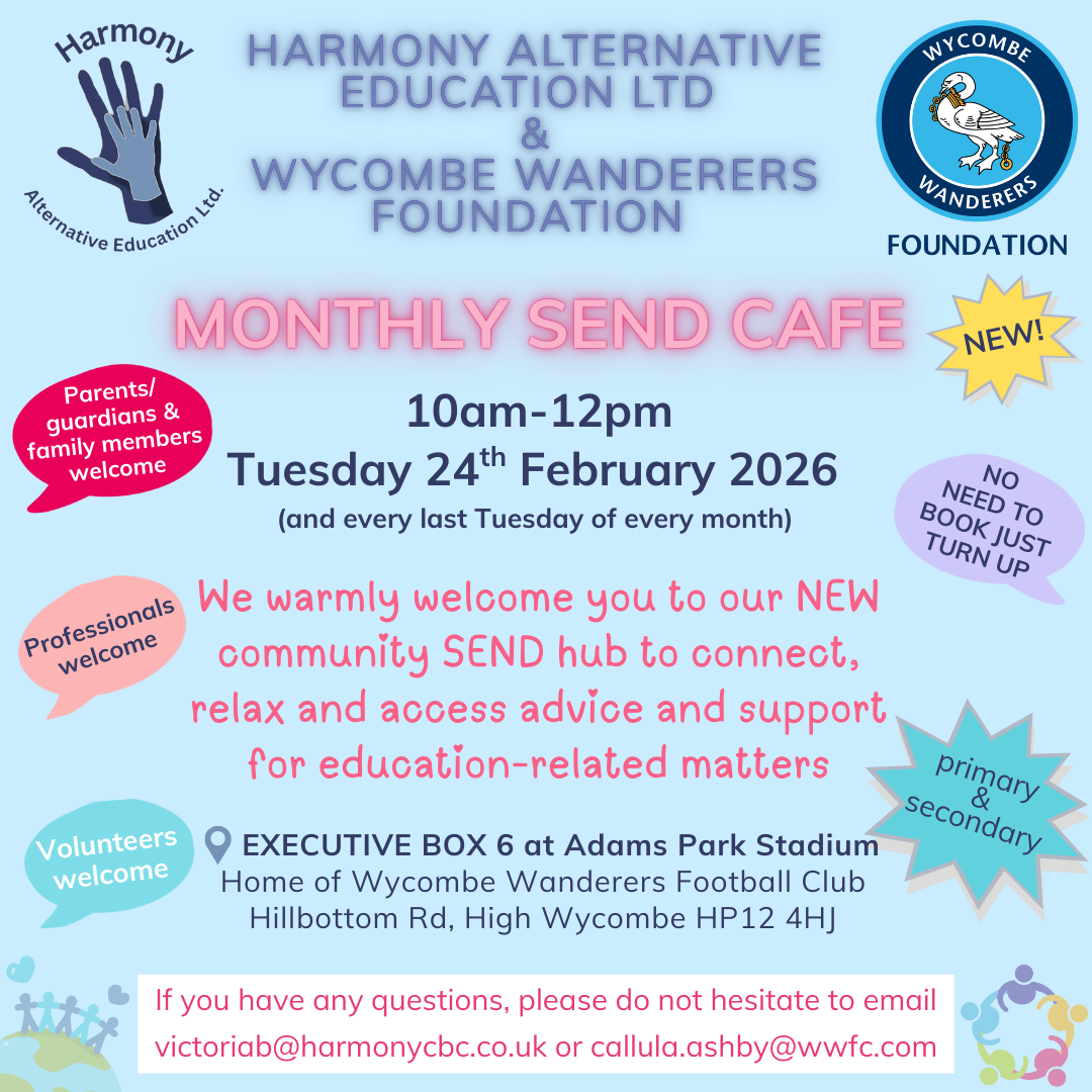 The Wycombe Wanderers Foundation SEND Café, in partnership with Harmony Alternative Education, provides a welcoming, safe, and understanding space for parents, carers, and professionals to come together, connect, and build supportive networks. The café offers a relaxed and informal environment where attendees can take time to share experiences, and access advice and support around education-related matters, helping to reduce isolation and promote positive wellbeing.